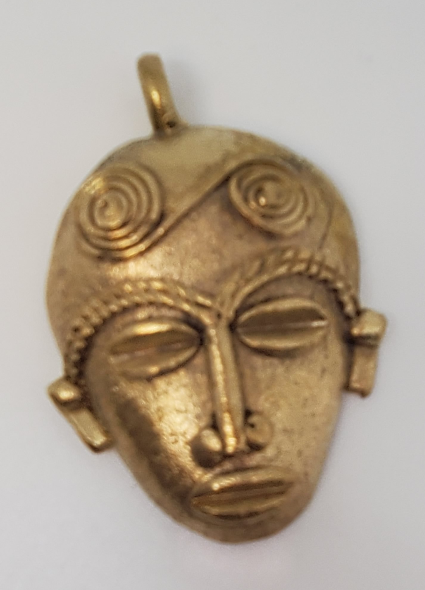 Este colgante de máscara está hecho a mano siguiendo la tradición del latón fundido a la cera perdida. Cada pieza se forma primero con cera de abejas y luego se cubre con arcilla dura. Las piezas de arcilla se calientan en un horno de piedra hecho a mano y el latón se vierte en el vacío creado por la cera de abejas. Cada pieza es única y representa reyes y reinas en la tradición Ashanti.
