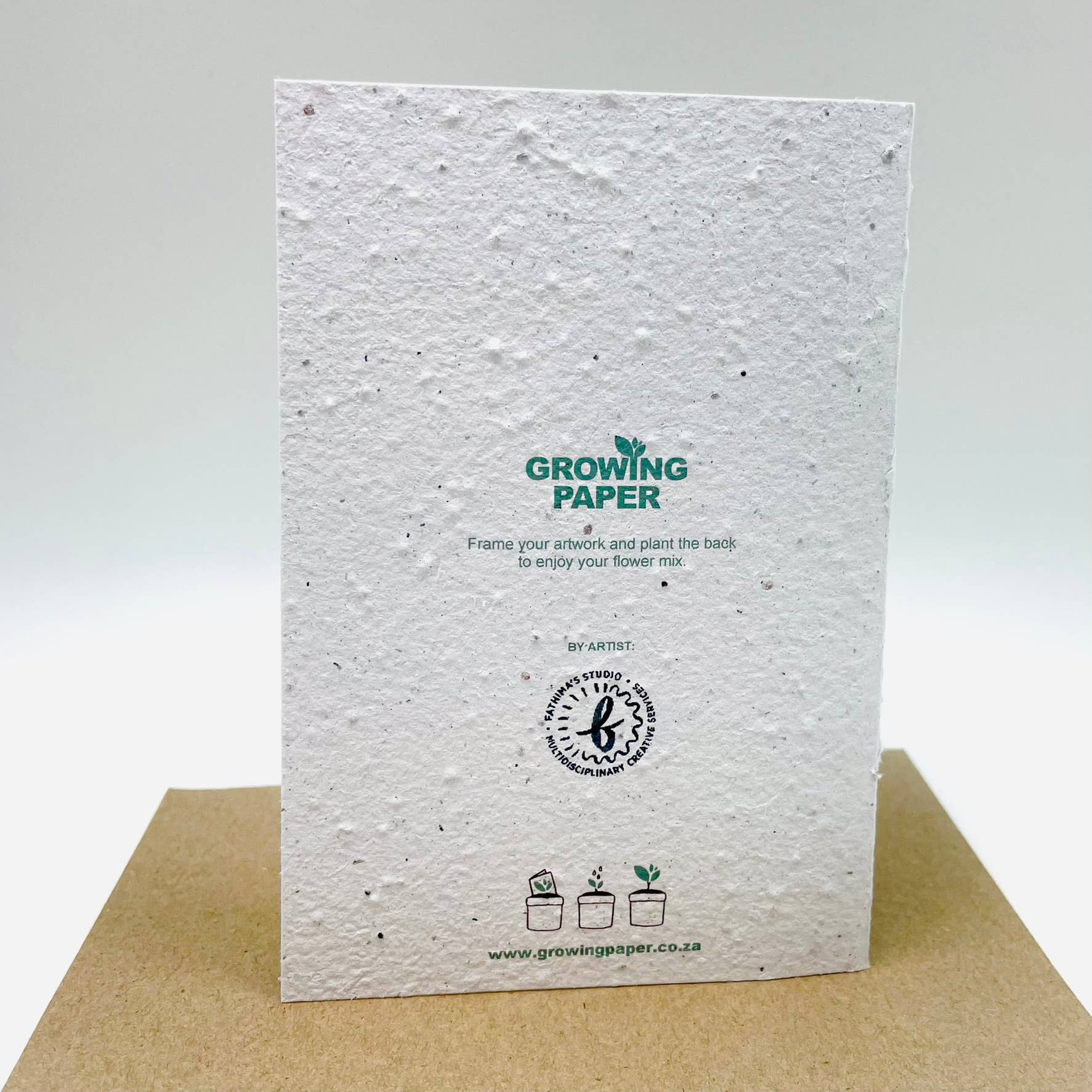 Greeting cards made in South Africa with recycled paper and seeds, giving the recipient the option to plant the card and grow flowers such as snapdragon and alyssum. All cards are blank inside and sold individually. The name and photo of the artisan who created the card will be shown on the insert or sticker, depending on packaging chosen.