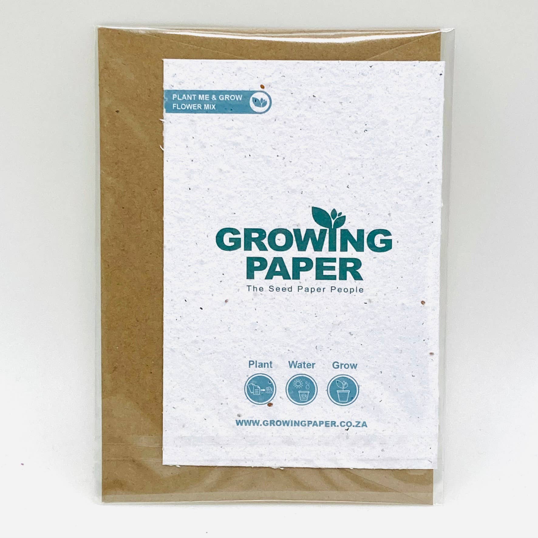 Tarjetas de felicitación fabricadas en Sudáfrica con papel reciclado y semillas, que le dan al destinatario la opción de plantar la tarjeta y cultivar flores como boca de dragón y alyssum. Todas las tarjetas están en blanco por dentro y se venden individualmente.