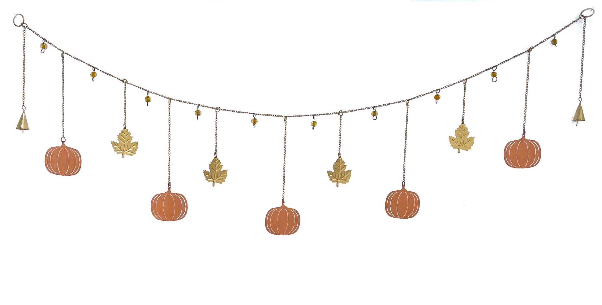 For everything, there is a season and this Harvest Garland is the perfect decoration for celebrating Autumn! This beautiful garland features alternating copper-colored pumpkins and gold leaves with gold beads in between each one. If using outdoors we recommend spraying with a clear coat to prevent rusting.