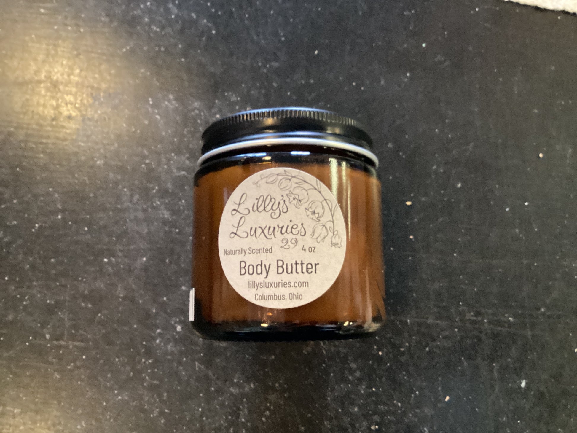 4 ounces of coconut oil,Shea, butter, olive oil, arrowroot powder, vitamin E, oil, beeswax, frankincense, myrrh, and sandalwood essential oils. Made here in Columbus, Ohio .