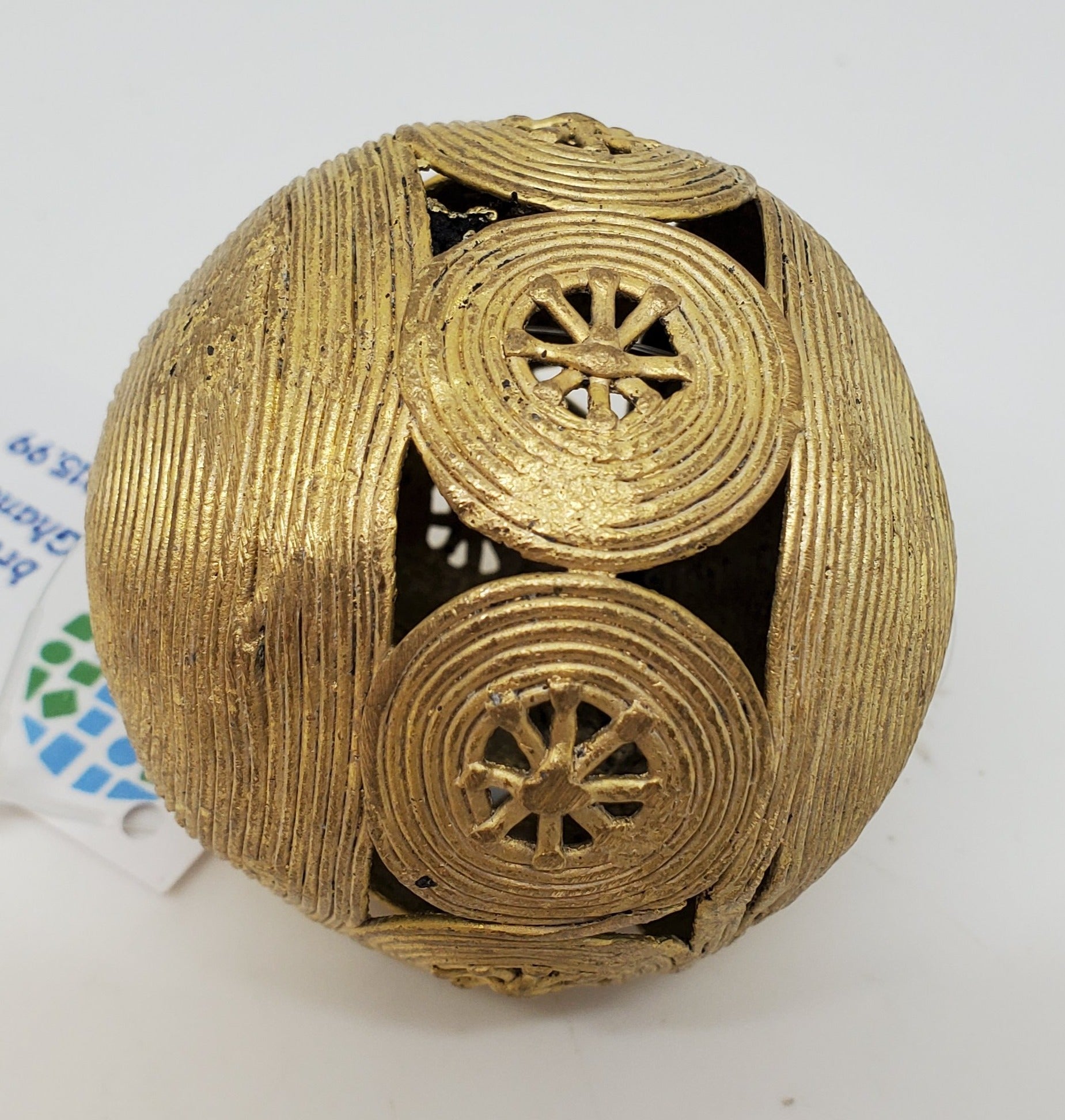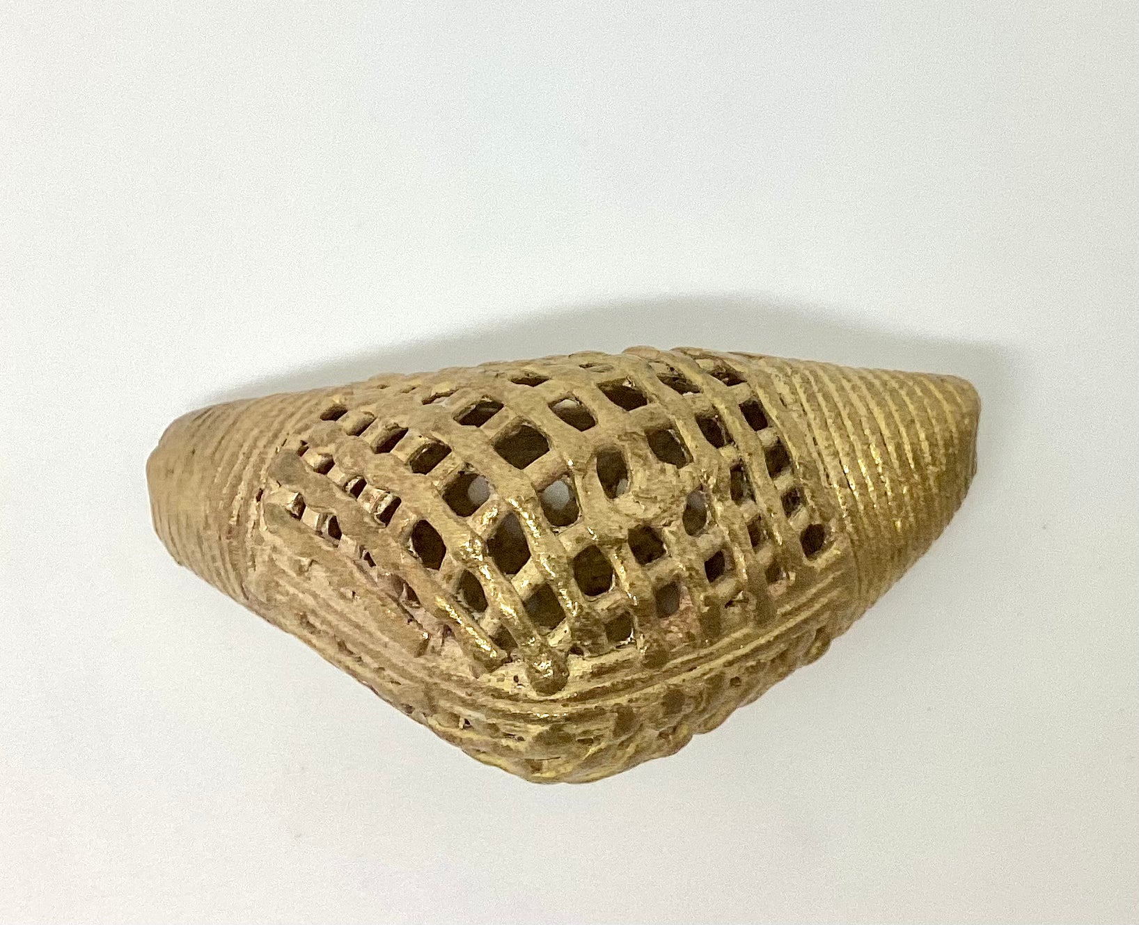 This bead is handcrafted in the lost wax cast brass tradition. Each piece is first formed in beeswax, then covered in hard clay. The clay pieces are heated in a handmade stone oven and the brass is poured into the void created by the beeswax. Made in Ghana.