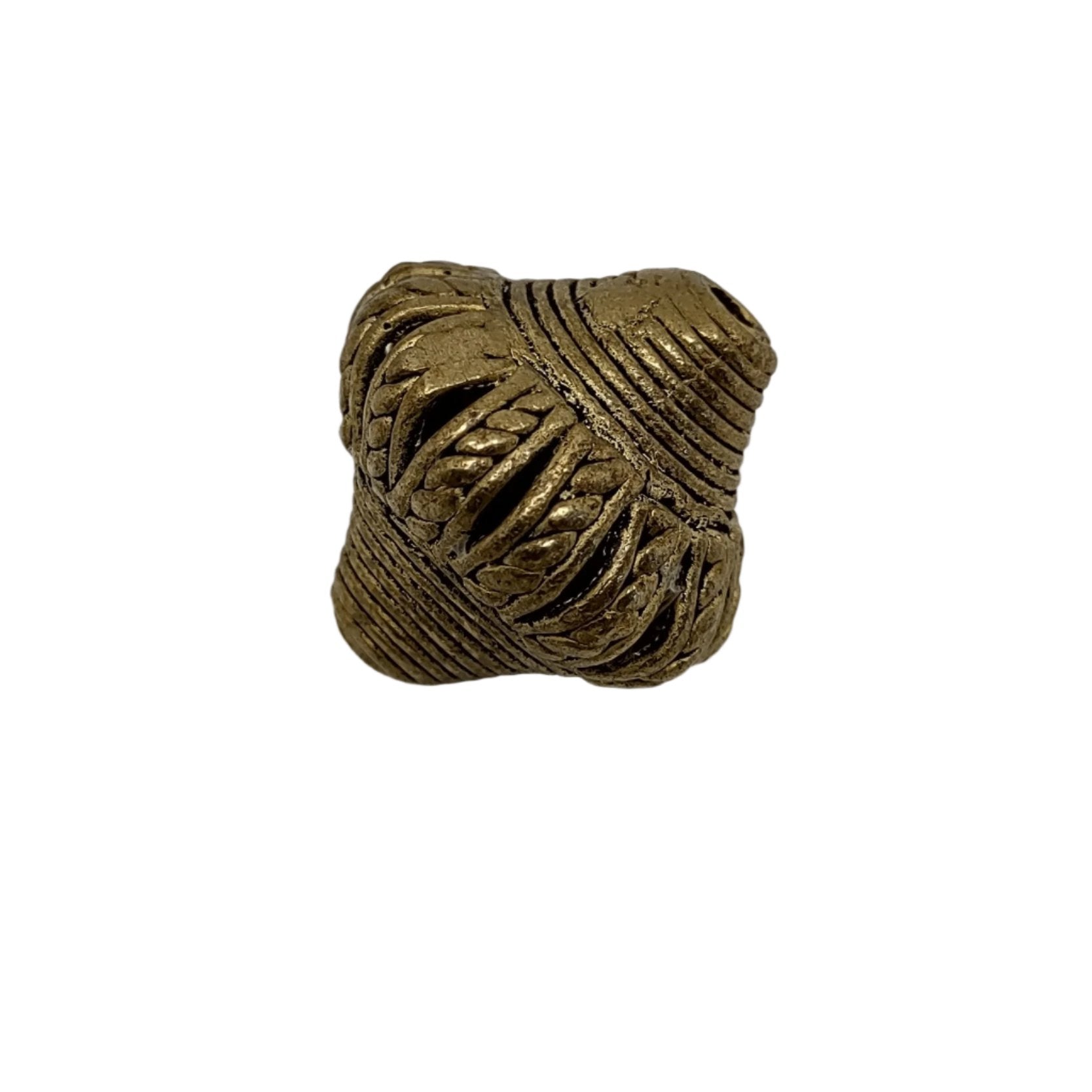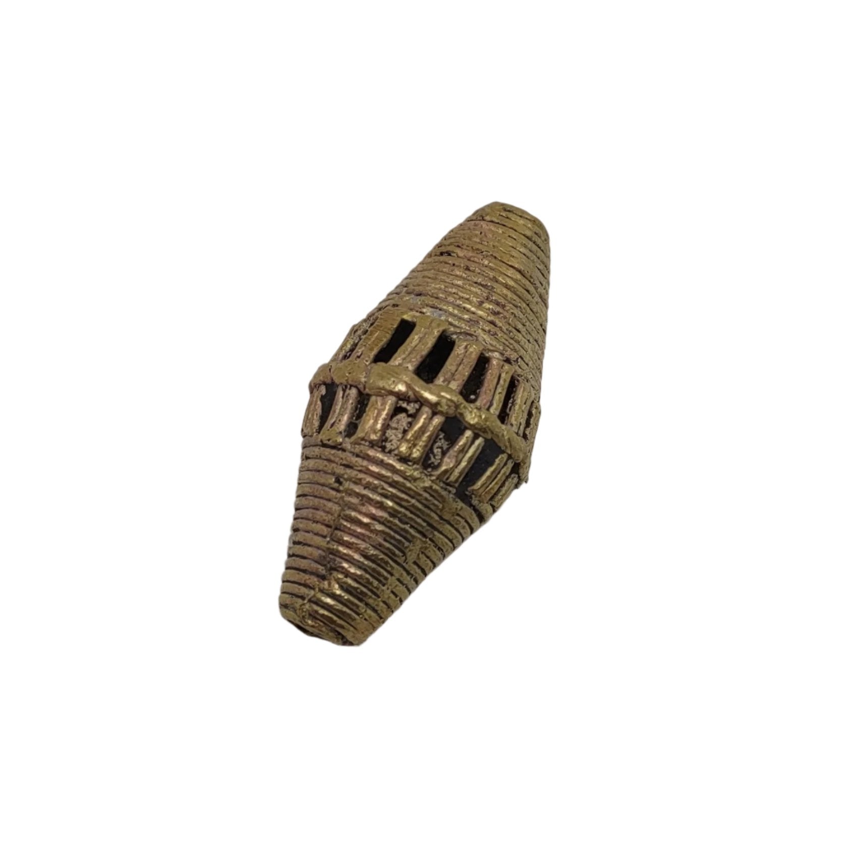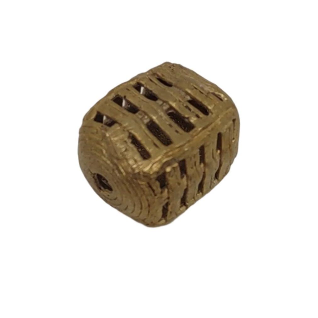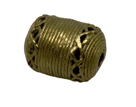 This bead is handcrafted in the lost wax cast brass tradition. Each piece is first formed in beeswax, then covered in hard clay. The clay pieces are heated in a handmade stone oven and the brass is poured into the void created by the beeswax.