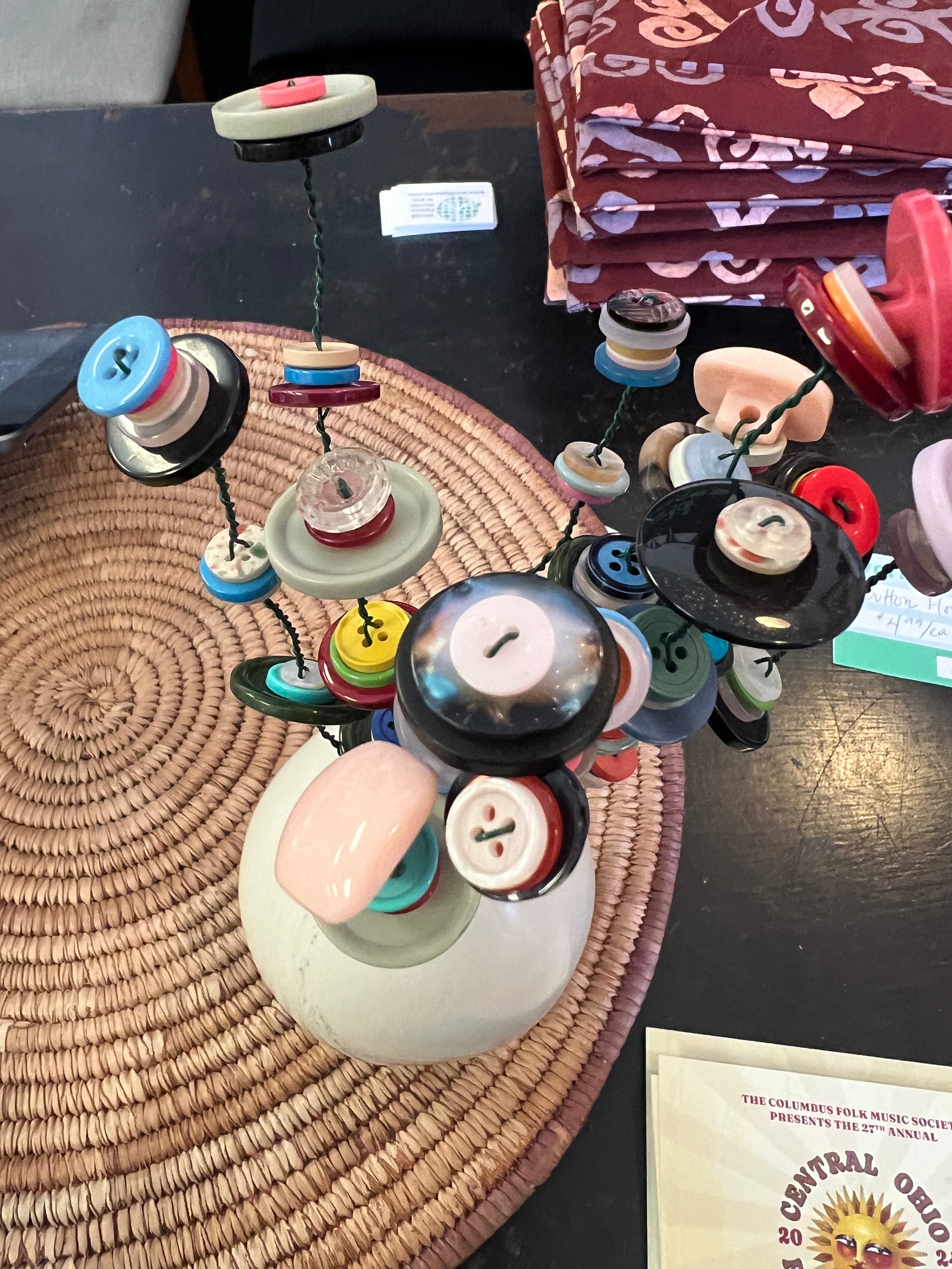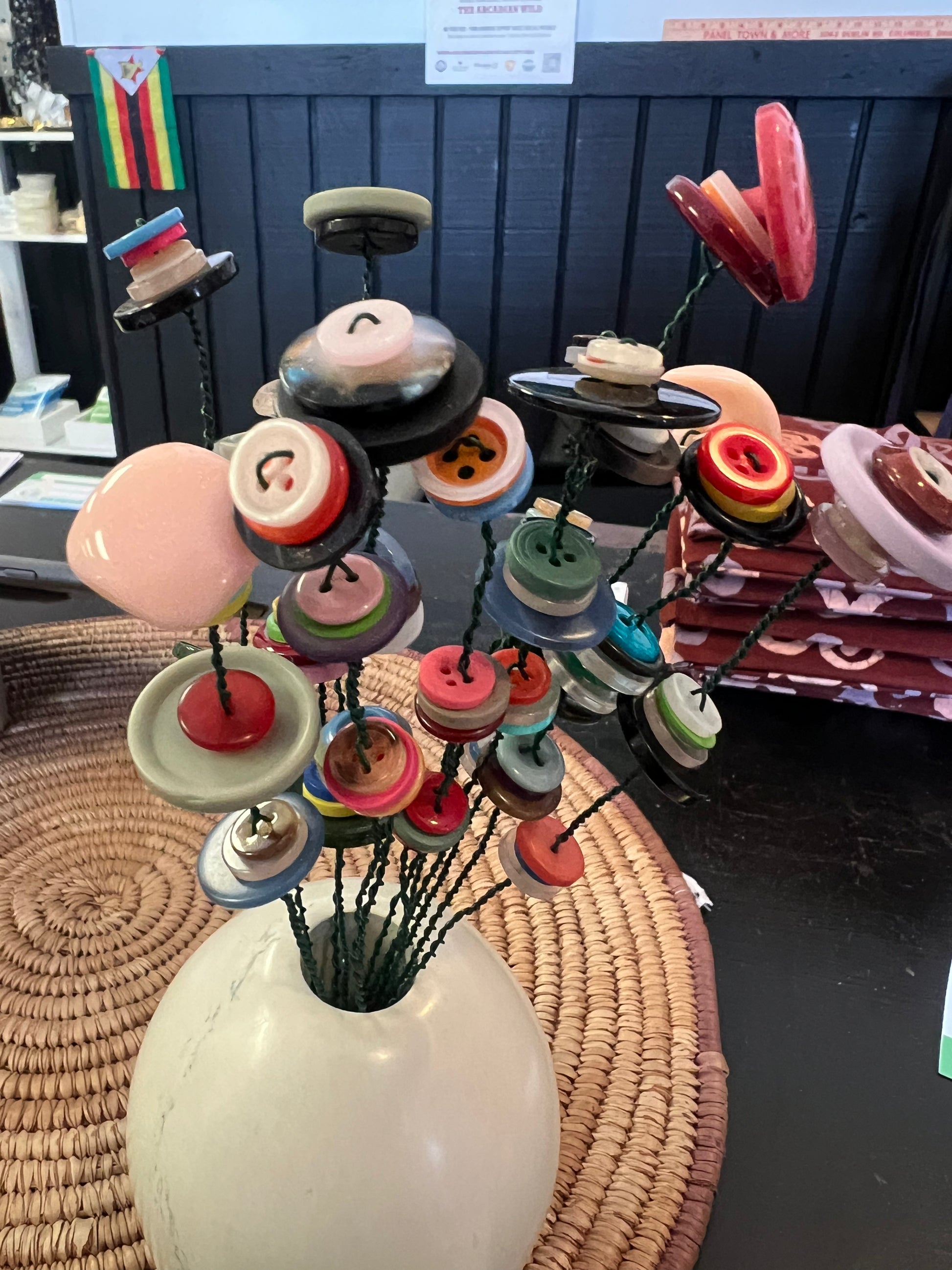 Simple button flower stems. Made by local Columbus creative Erika Bodnar. Supports her ongoing journey to health and happiness. 7-10” high. Each flower is unique.