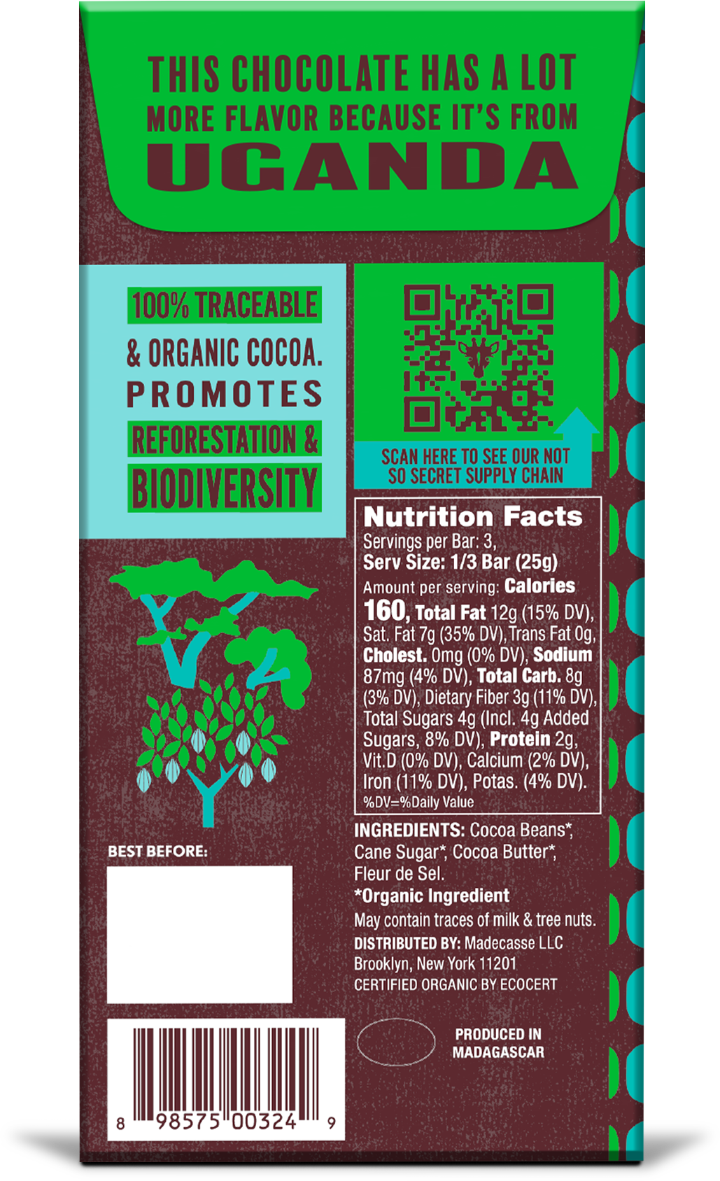 This dark chocolate bar features 85% Uganda chocolate and is enhanced with a touch of sea salt for a deliciously unique flavor. By using only cocoa beans from a single source, the bar offers a rich and pure chocolate taste unlike any other. And with bright pops of sea salt, every bite is an explosion of flavor that will leave you feeling satisfied and indulged.