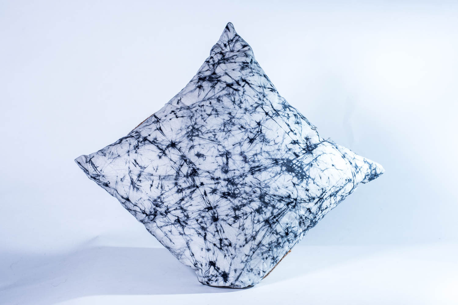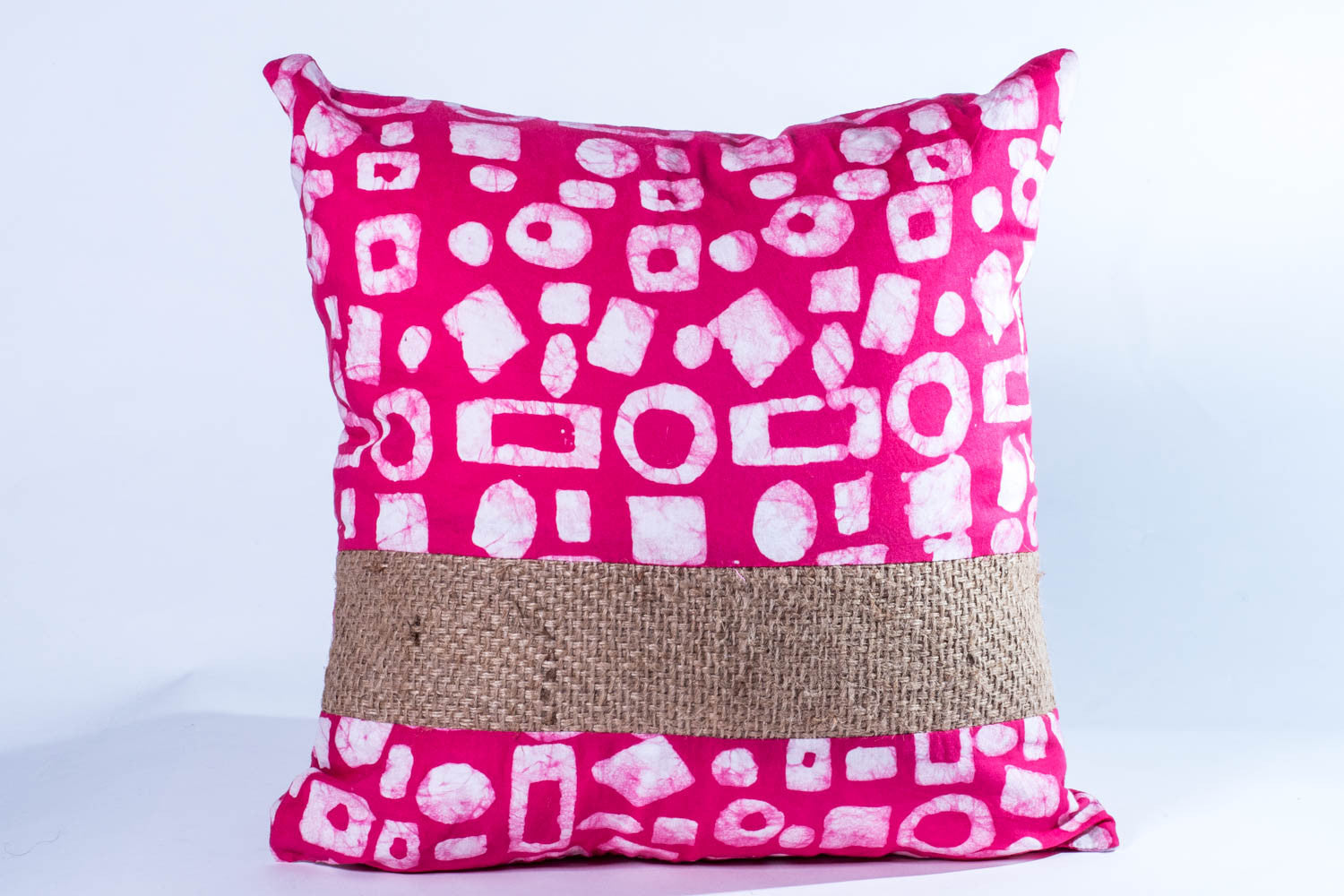 Batik pillow with upcycled coffee bag burlap accent. Batik fabric is made by creating wax designs then dying the fabric. Wax works as a color blocker in this dying process.