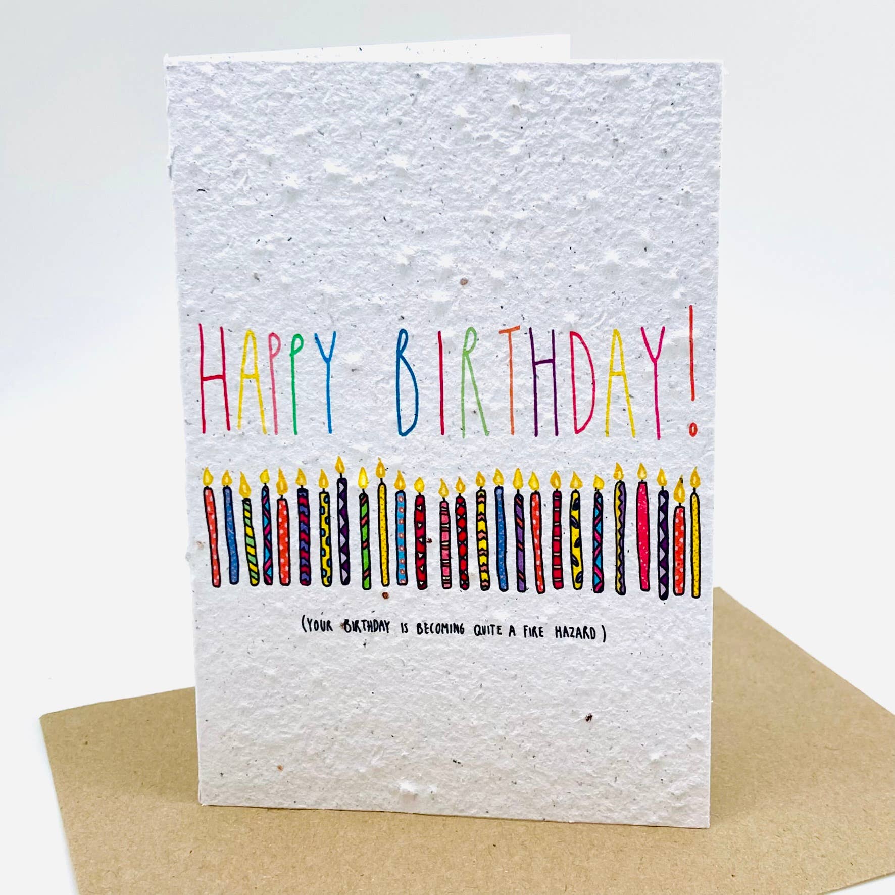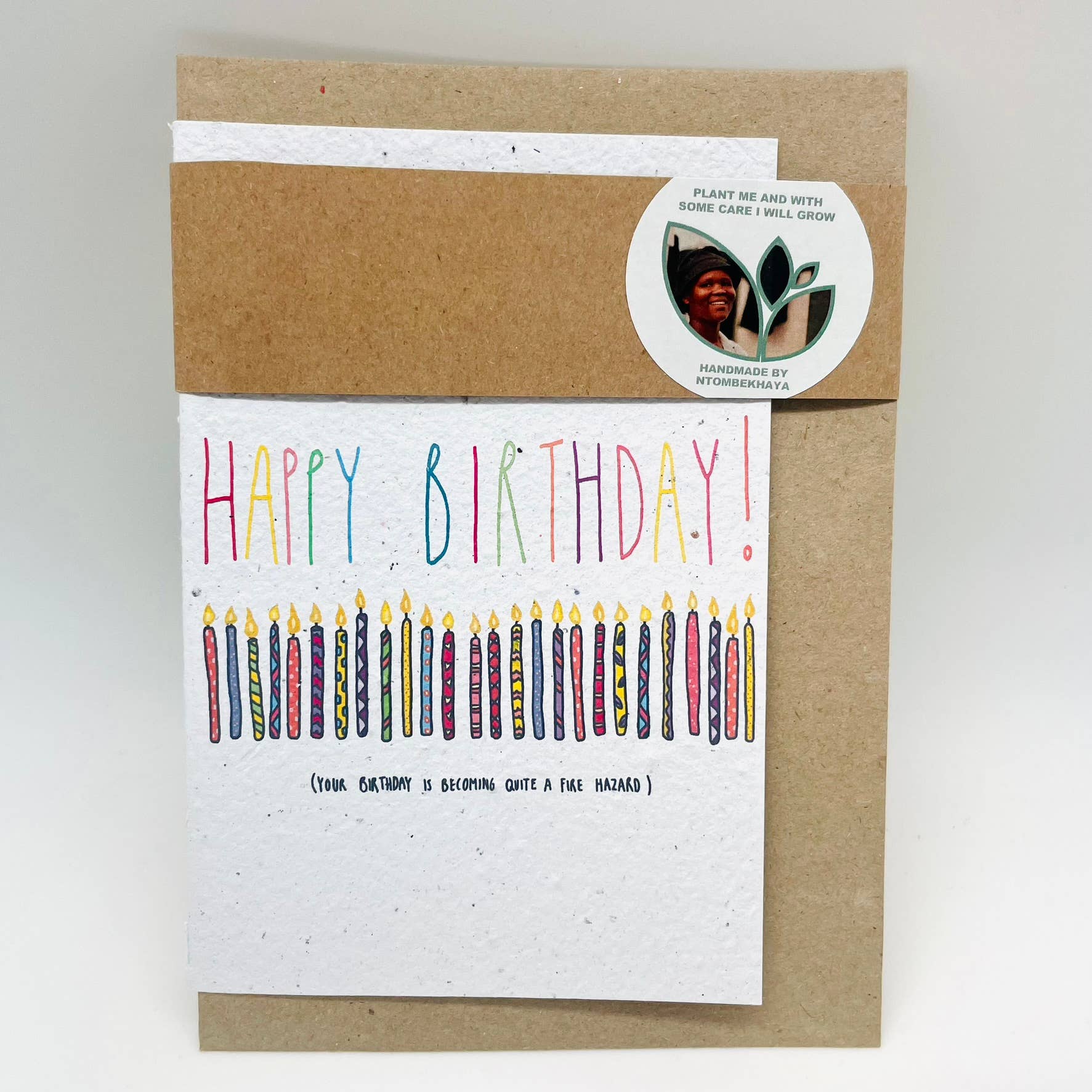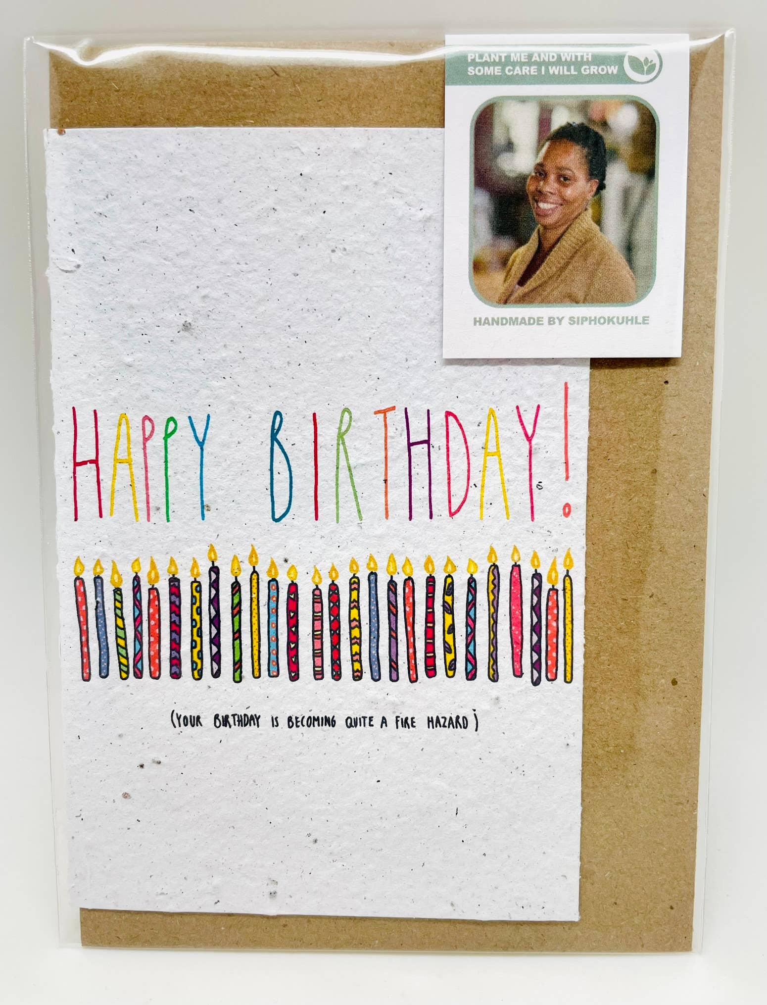 The name and photo of the artisan who created the card will be shown on the sticker, depending on packaging chosen. Text on front reads "Happy Birthday (your birthday is becoming quite a fire hazard)" Dimensions: 4.75" x 6.5" (with tan envelope)