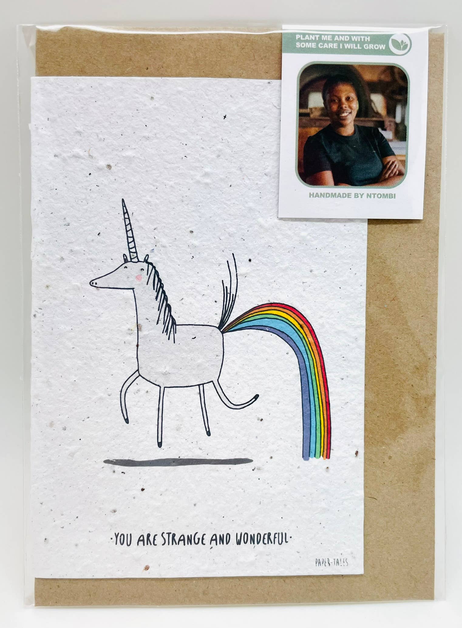 Greeting cards made in South Africa with recycled paper and seeds, giving the recipient the option to plant the card and grow flowers such as snapdragon and alyssum. All cards are blank inside and sold individually. The name and photo of the artisan who created the card will be shown on the insert or sticker, depending on packaging chosen.