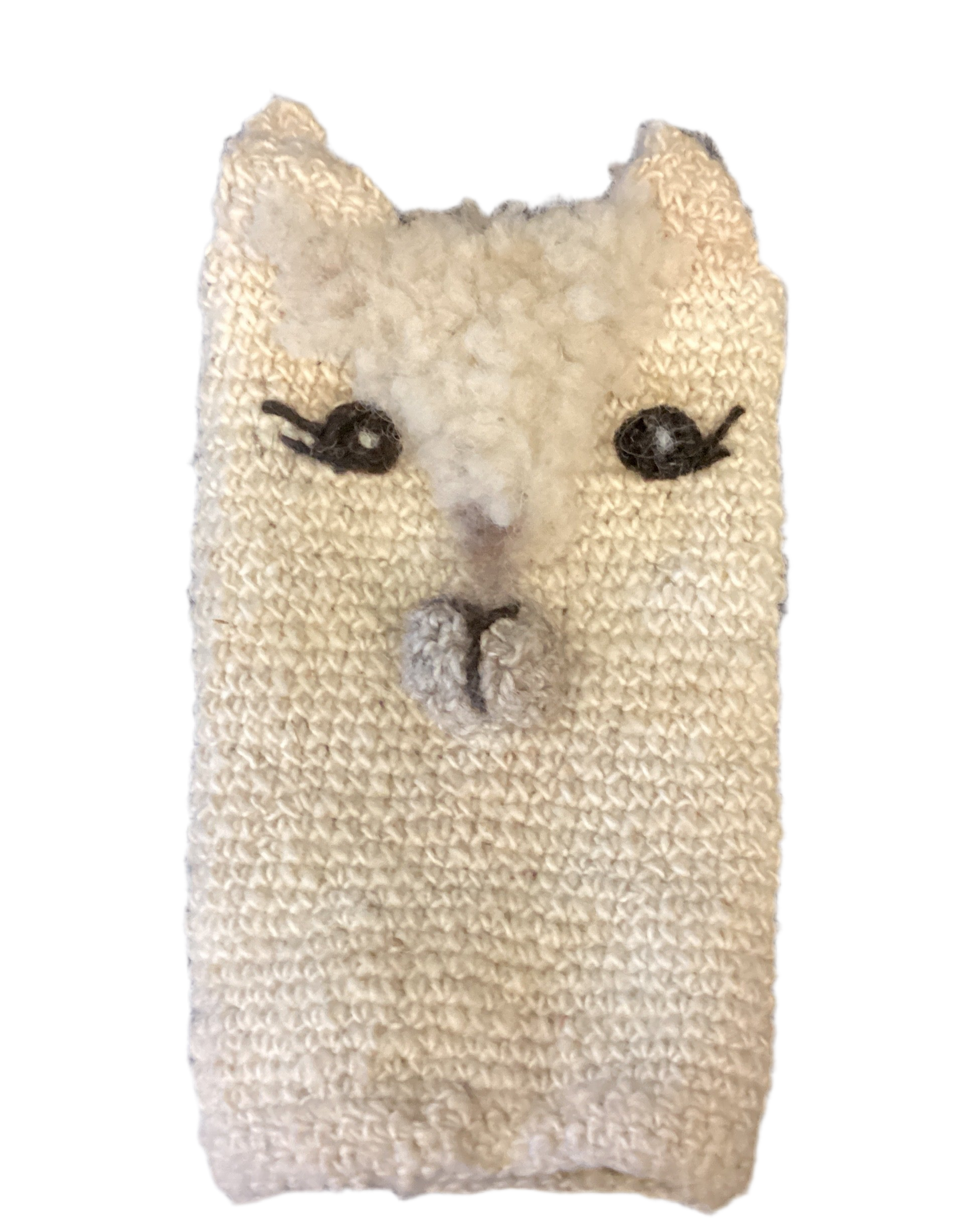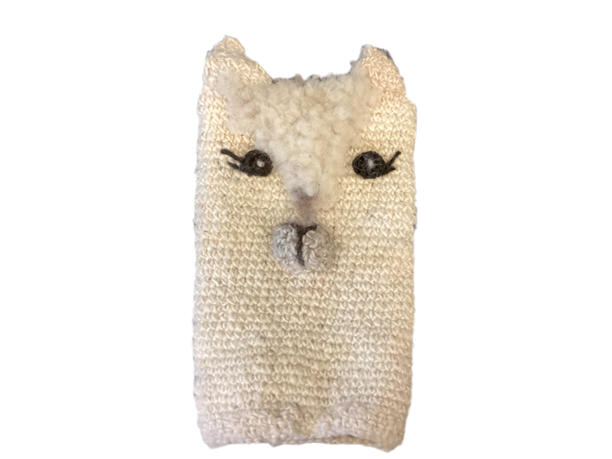 Wine bottle llama koozie crafted with handspun wool in Bolivia.