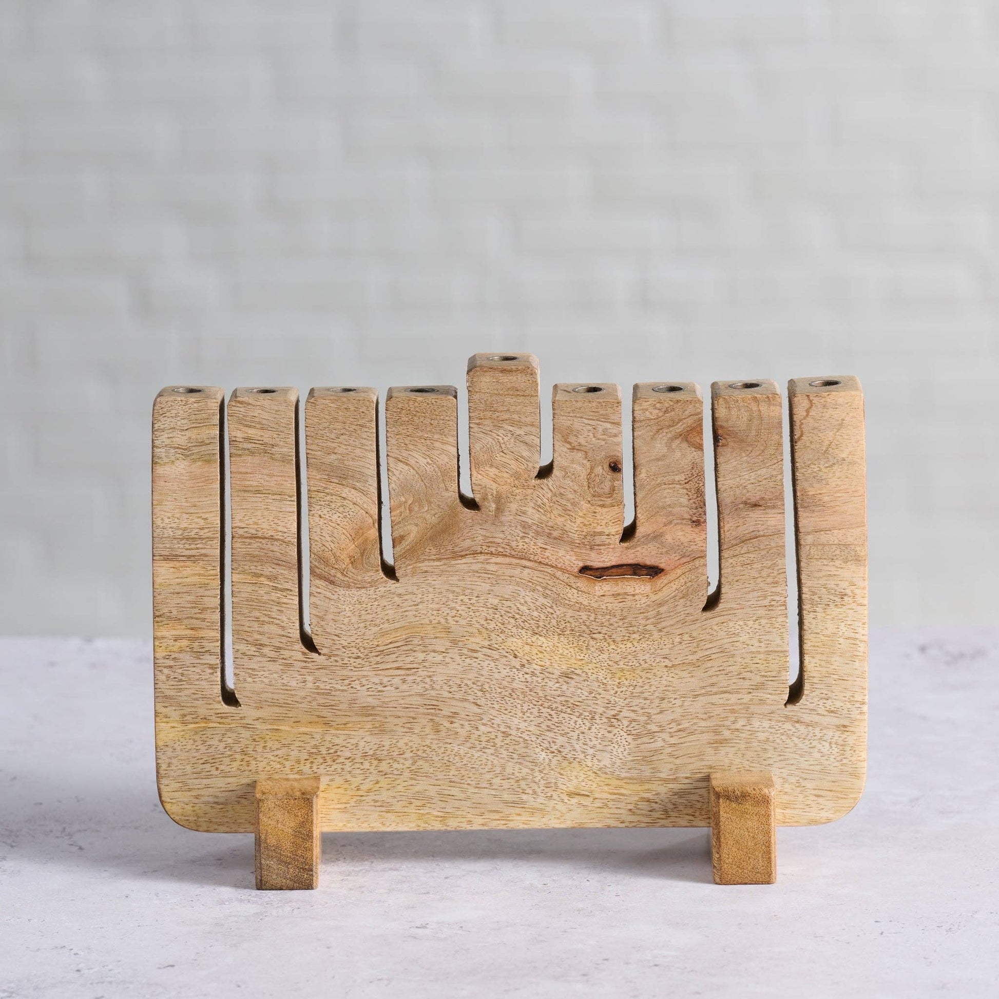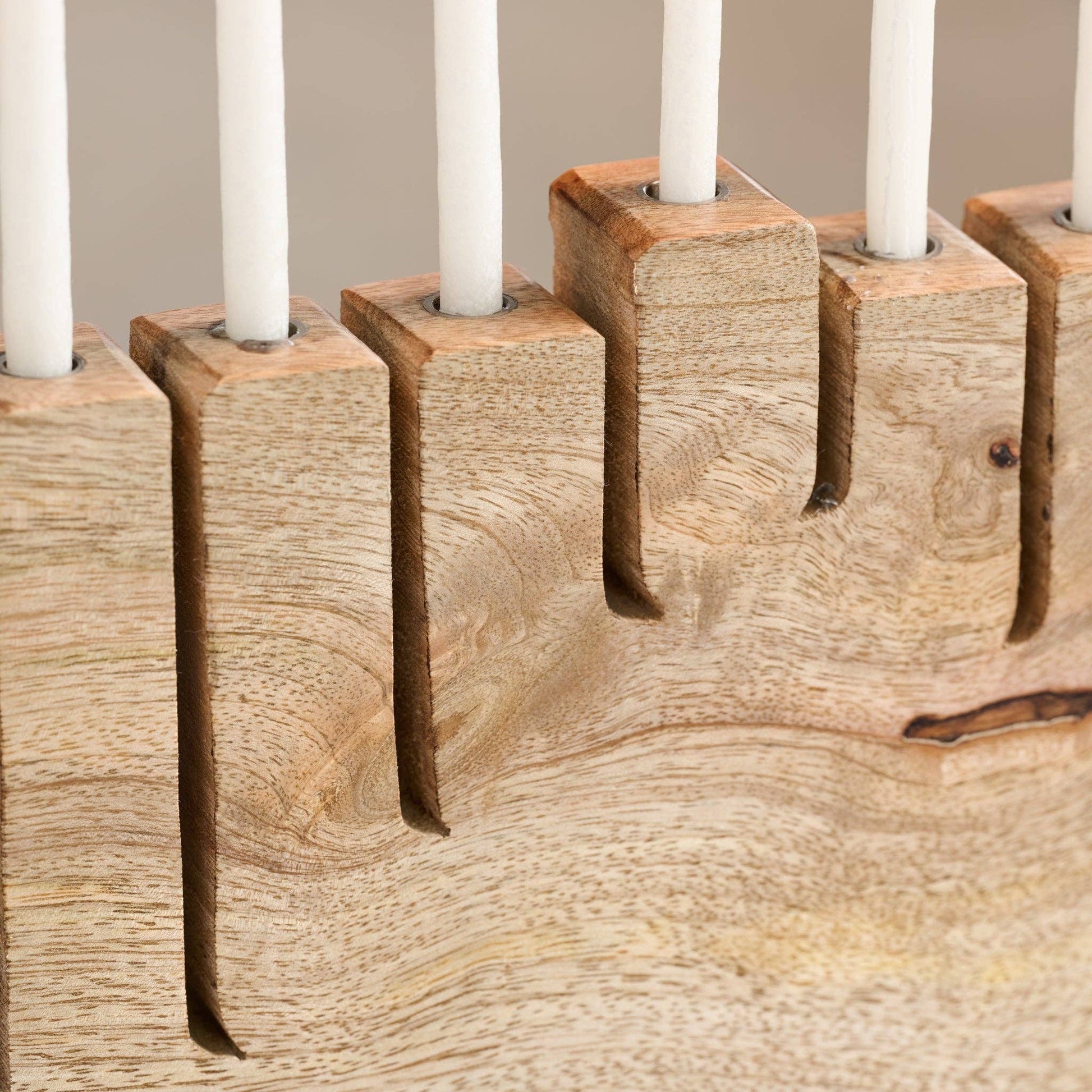Celebrate the miracle of Hanukkah with this functional and meaningful symbol of faith and tradition! Highlighting the natural variations of wood, this beautifully handcrafted menorah has a rustic aesthetic that will warm your heart and home as you observe the holiday. Carved from a single block of mango wood, it features 9 individual candleholders reinforced with stainless-steel interiors, rounded edges and corners and a smooth, shiny finish. The menorah fits snugly into two removable braces that provide a solid, stable base. A remarkable piece designed to serve your family for years to come. This Ten Thousand Villages Exclusive is lovingly handcrafted by artisans with Asha Handicrafts Association, which has promoted the social and economic development of artisans throughout India for more than 40 years.