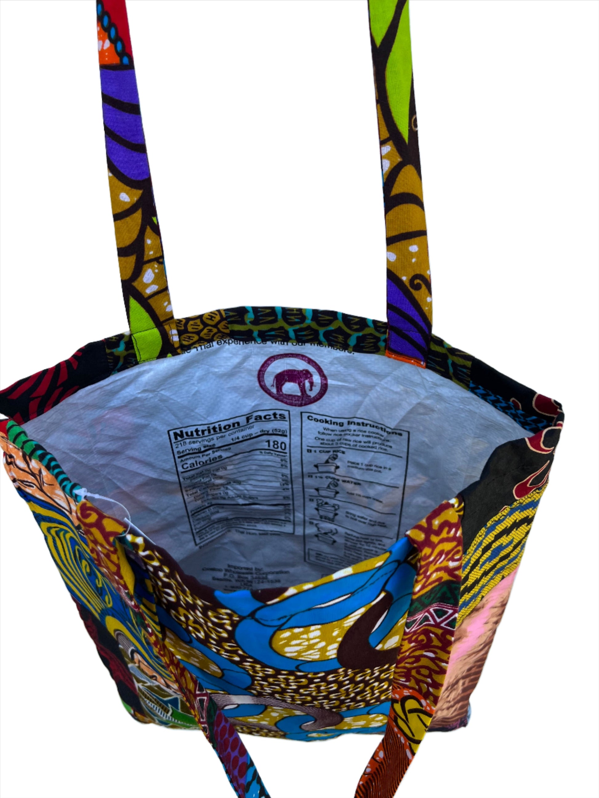 These bright and cheery shopping bags made of patchwork Ankara fabrics make any purchasing experience feel sunny. Lined with various upcycled materials - from rice bags to birdseed bags, sustainability is built in. Featuring straps 12" long and a box bottom to allow for lots of goodies inside. Bag body measures 16"x14"x3"
