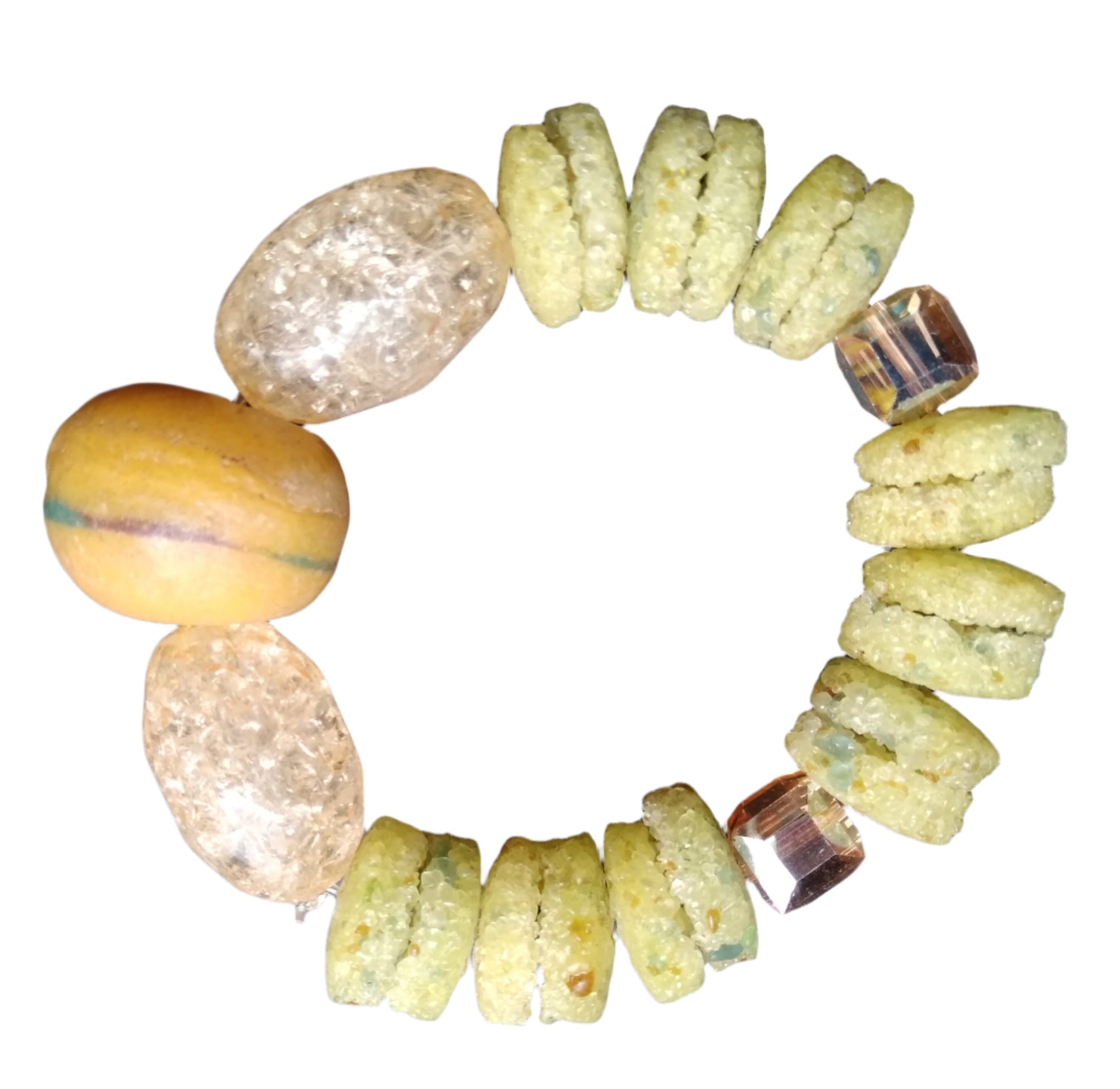 The Earth Essence Textured Bead Bracelet is a stunning fusion of nature-inspired tones and artisanal craftsmanship. Featuring textured pale-green recycled glass beads, warm amber-hued accent beads, and a striking multicolored focal bead, this bracelet embodies the beauty of natural elements.