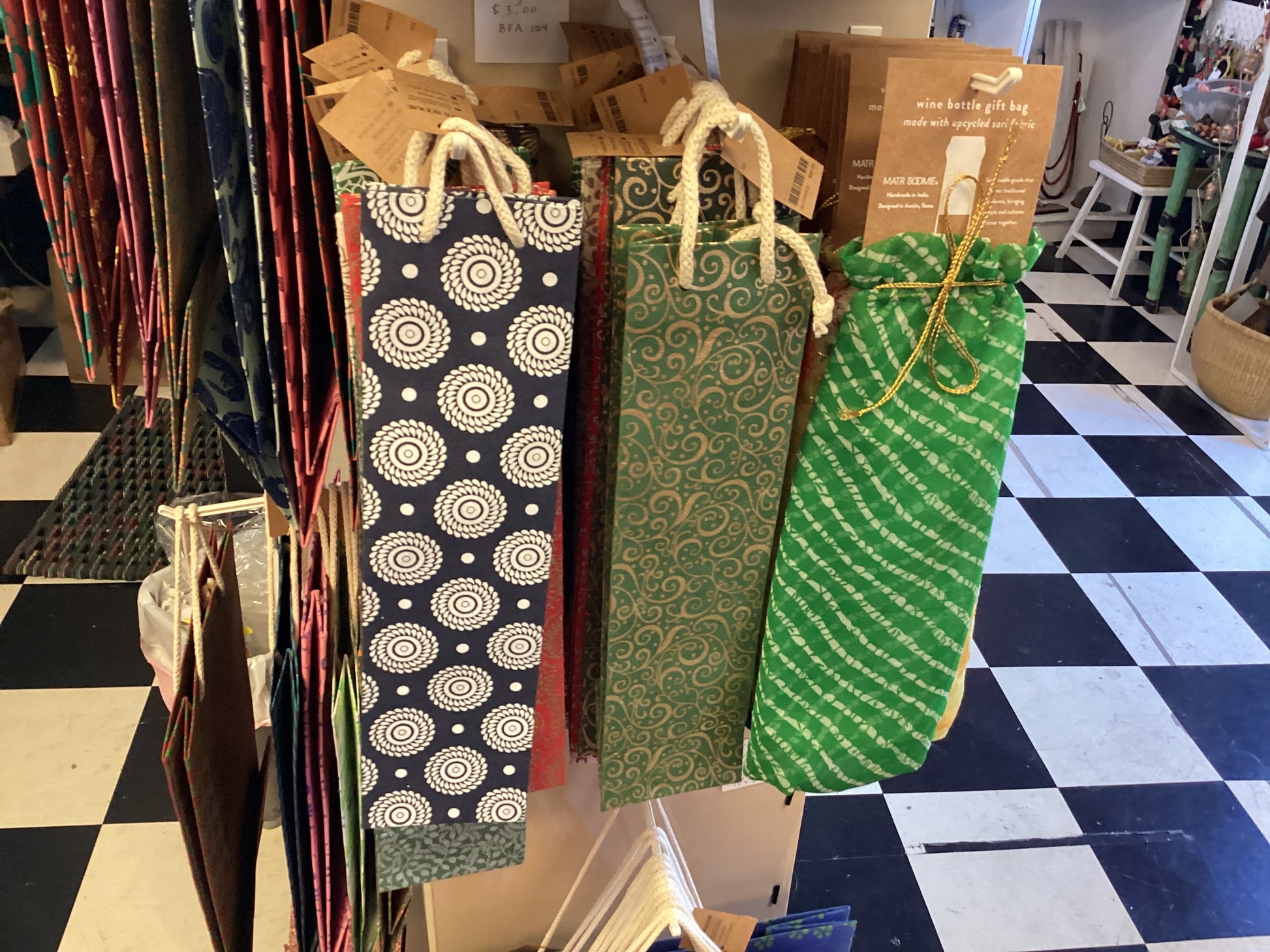 These Eco, friendly and tree free wine gift bags come in an assortment of colors and patterns. They measure 14 x 3.75.